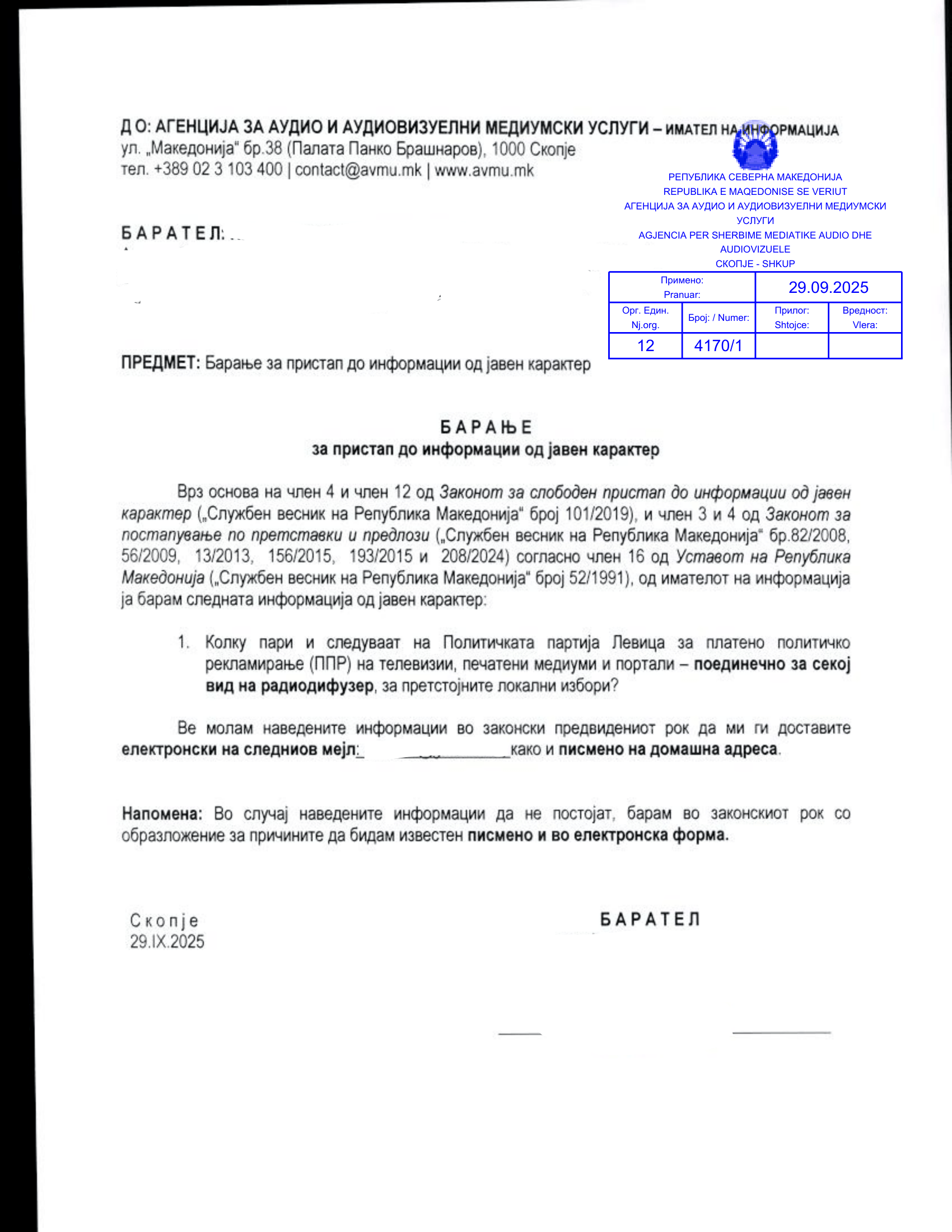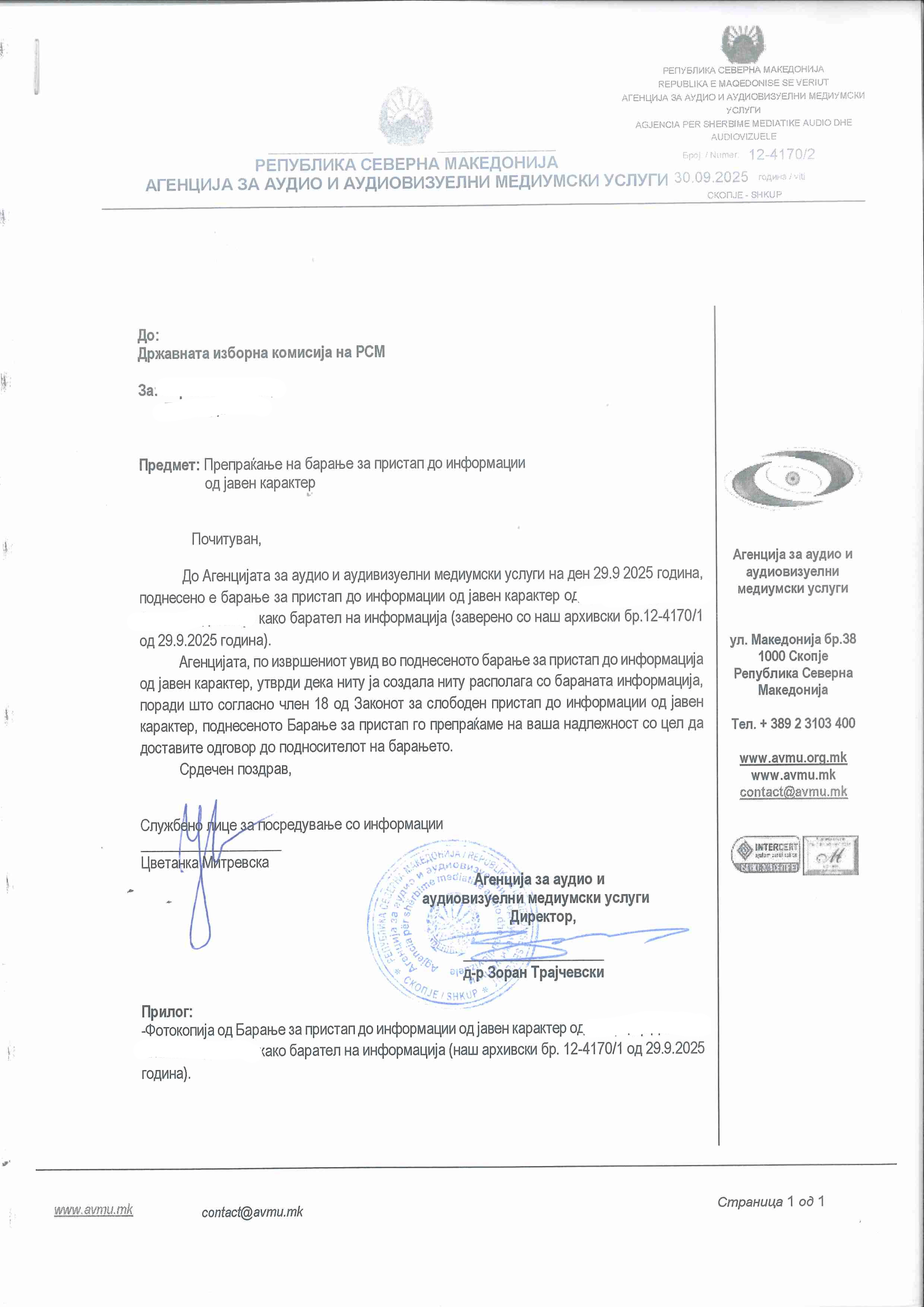 Препраќање на барањето за пристап до информации од јавен карактер до ДИК – 30.09.2025