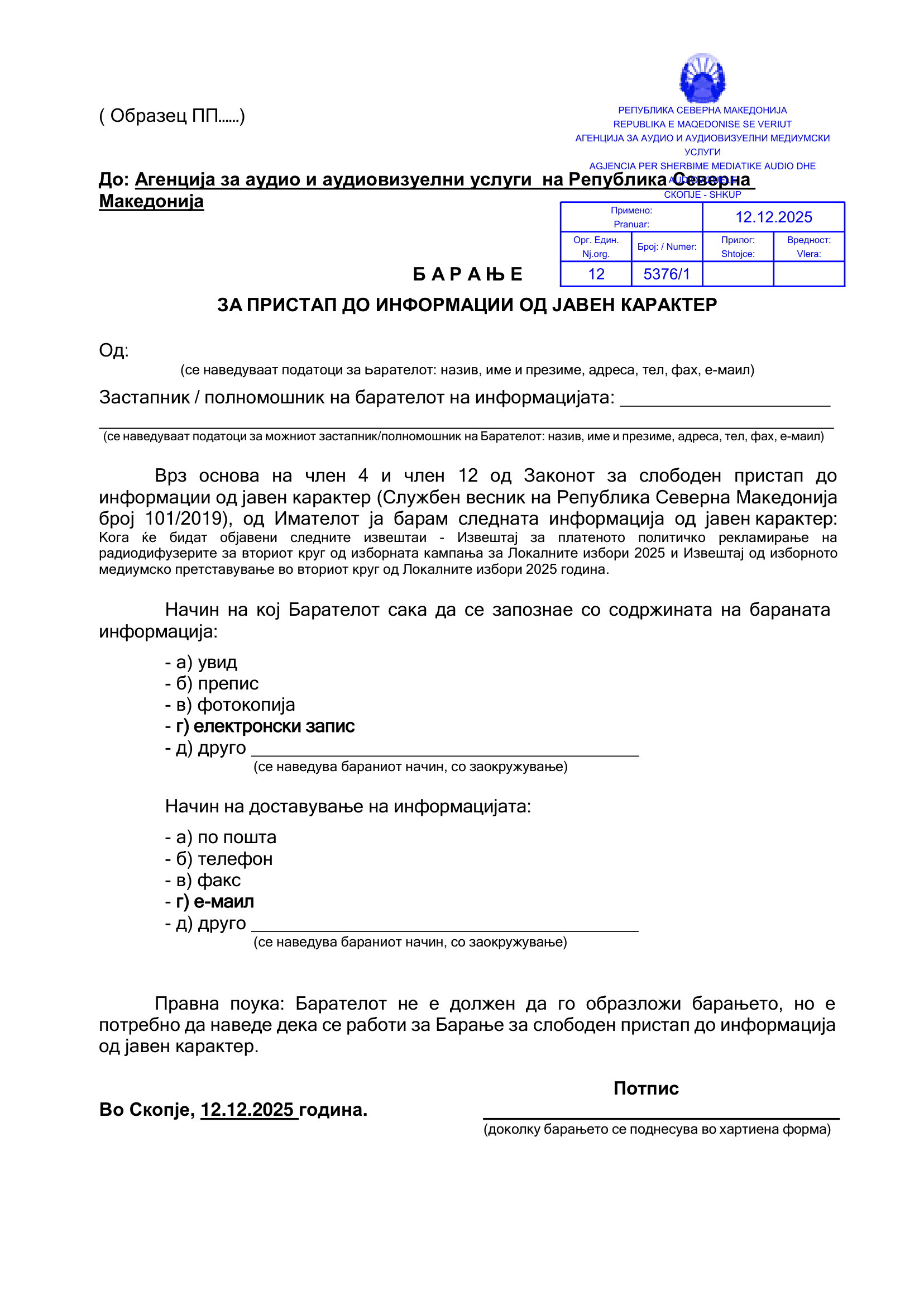 Решение за позитивен одговор на барањето за пристап до информации од јавен карактер – 17.12.2025
